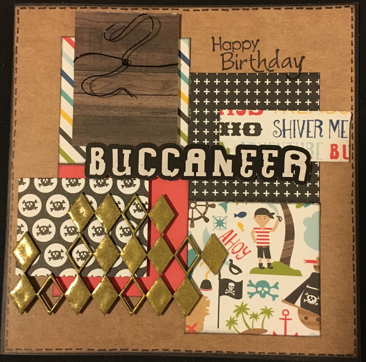 To begin with I have created a birthday card that would be good for a little buccaneer. Which reminds me, Happy Birthday Jo for the 9th of November. I hope you had a great day! For this card I have used a Kaisercraft Kraft Card and have used some off cuts from the 'Pirates Life' 6x6 paper pad. I have used some black wire to create a feature in the left hand corner and have used a Happy Birthday stamp for the sentiment. Again I have used the 2 Crafty Harlequin Clumps as an embellishment which I have inked with VersaMark Gold Ink and embossed with Metallic Melts - Gold Nugget.